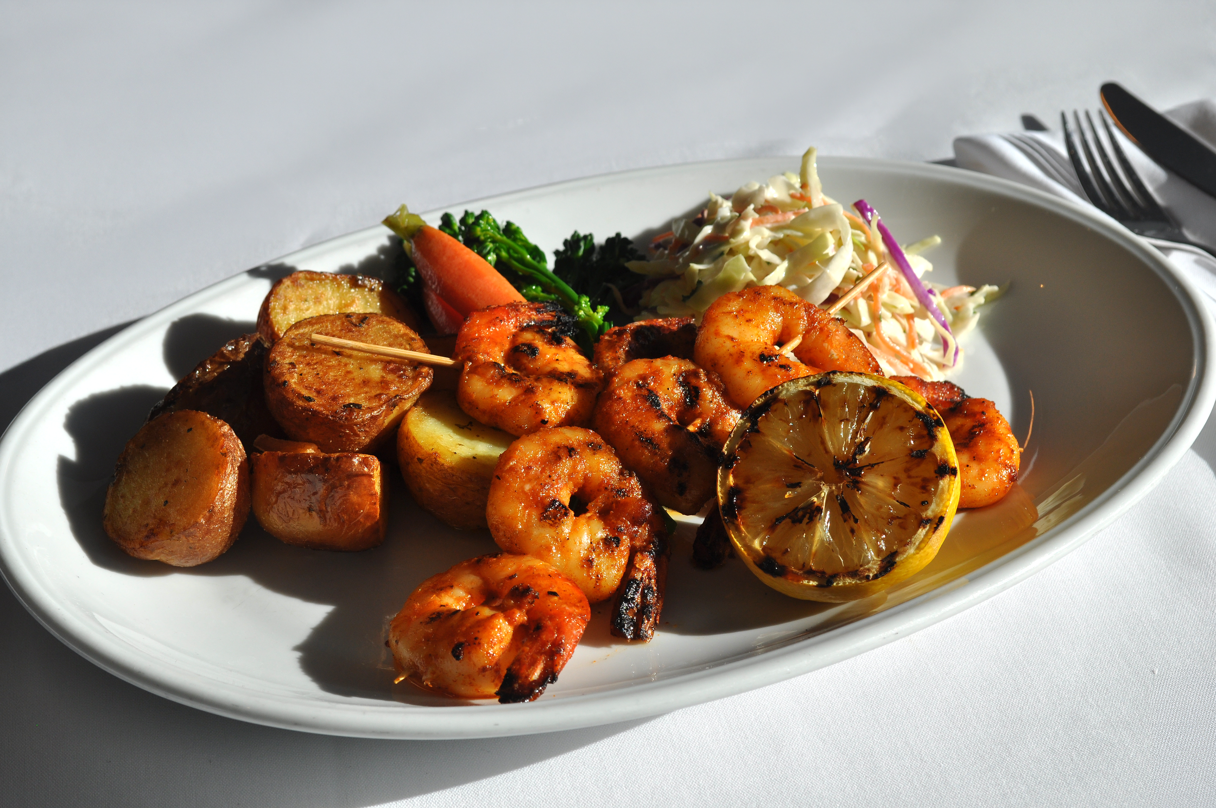 herb roasted potatoes, creamy coleslaw, grilled corn on the cob